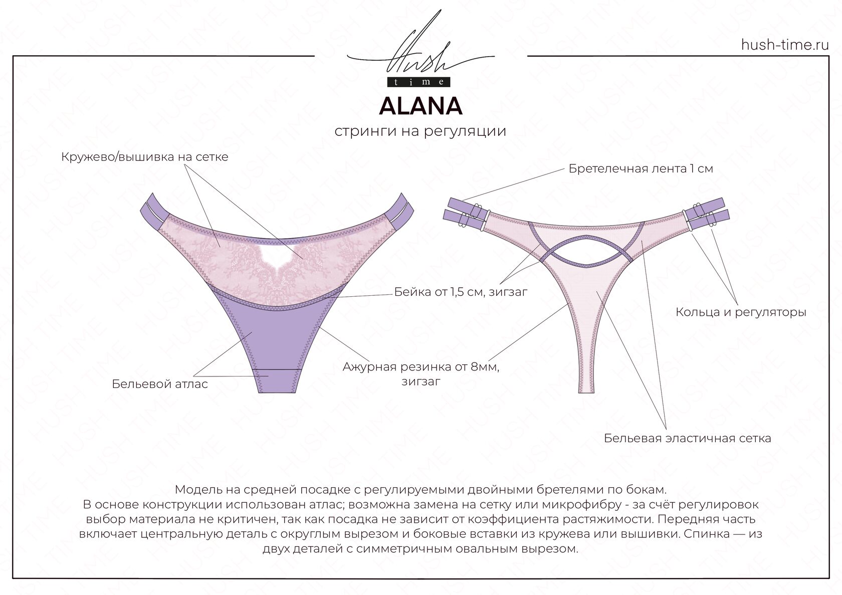 Модель на средней посадке с регулируемыми двойными бретелями по бокам. В основе конструкции использован атлас; возможна замена на сетку или микрофибру - за счёт регулировок выбор материала не критичен, так как посадка не зависит от коэффициента растяжимости. Передняя часть включает центральную деталь с округлым вырезом и боковые вставки из кружева или вышивки. Спинка — из двух деталей с симметричным овальным вырезом.